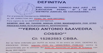 El pasado 16 de enero, el sicario obtuvo ilegalmente libertad definitiva del penal de mínima seguridad de San Antonio, donde estuvo recluido por robo agravado y otros delitos, sin haber cumplido su pena sin derecho a indulto en la penitenciaría de máxima seguridad de El Abra por el delito de asesinato en grado de tentativa. | Foto Sol de Pando Para ...Leer más