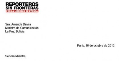 Carta de Reporteros sin Fronteras exigiendo Libertad de Prensa a la ministra Dávila