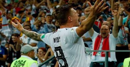 Toni Kroos, otro astro del Real Madrid, festeja su milagroso gol con los hinchas alemanes en el estadio Fisht Olympic de la ciudad rusa de Sochi. | Foto Antena 2 © Caracol Radio La Selección de Alemania venció 2-1 a Suecia en encuentro que se jugó este sábado en el Estadio Fisht de la ciudad de Sochi por el Grupo «F. Ola ...Leer más