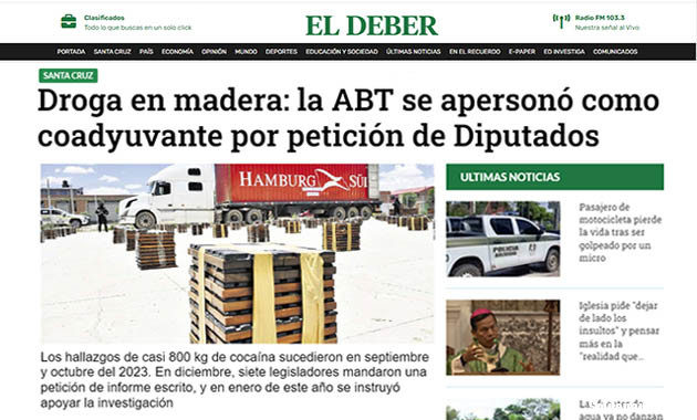 “En su edición del 28 de enero de 2024, el periódico El Deber informó que aquella modalidad del comercio exterior de la cocaína, desde el sector forestal, se había detectado a partir de 2023 cuando fueron incautados en el puerto de Arica 800 kilos de cocaína, entre septiembre y octubre, en dos cargamentos de madera hacia Bélgica y Emiratos Árabes enviados por importantes aserraderos de Santa Cruz”.