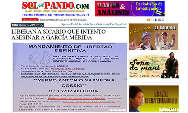 El 16 de febrero de este año, Sol de Pando denunció la ilegal liberación del sicario Yerko Saavedra por parte de la juez de Ejecución Penal de Cochabamba, Giovana Torrico Díaz. Funcionarios de Régimen Penitenciario y del Ministerio de Gobierno, vinculados a García Linera, promovieron el criminal prevaricado de la juez Torrico. | Foto Sol de Pando
