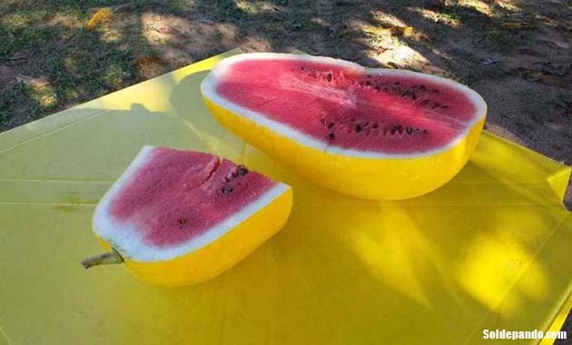 Por fora ela é amarela e é até confundida com o melão gigante, mas por dentro continua vermelhinha.