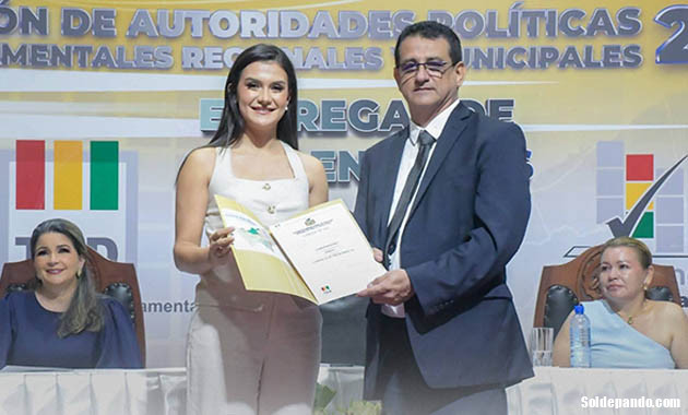 La Gobernadora entrante, Gabriela de Paiva, recibe su credencial de manos del Presidente del TED, Jorge Justiniano. | Foto Sol de Pando