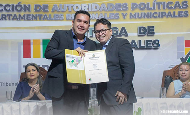 El vocal del TED Adel Jamit Mukay entrega la credencial al Alcalde entrante, Diego Suárez. | Foto Sol de Pando